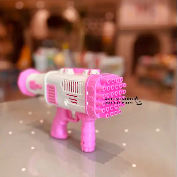 همچنین این محصول به همراه دو عدد مایع حباب زنی مخصوص به رنگ های آبی و صورتی عرضه می شود که برای بهتر عمل کردن تفنگ بهتر است از آن استفاده کنید.