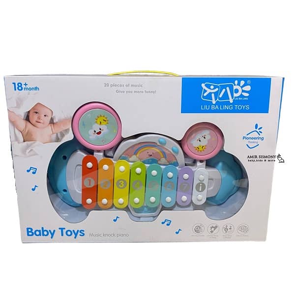 دو عدد مضراب به همراه این اسباب بازی نوزادی قرار دارد که کودک می تواند با استفاده از آن ها روی تیغه ضرب گرفته و موزیک های متفاوتی بنوازد.